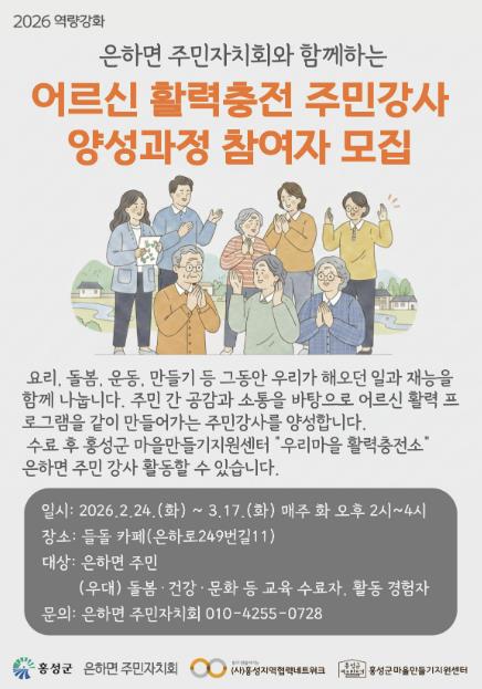 [뉴스노크=김인호 기자] 홍성군 은하면 주민자치회는 홍성군 마을만들기 지원센터와 함께 지역 내 어르신 돌봄과 마을 공동체 활성화를 위해 ‘어르신 활력충전 주민강사 양성과정’ 참여자를 모집한다.
