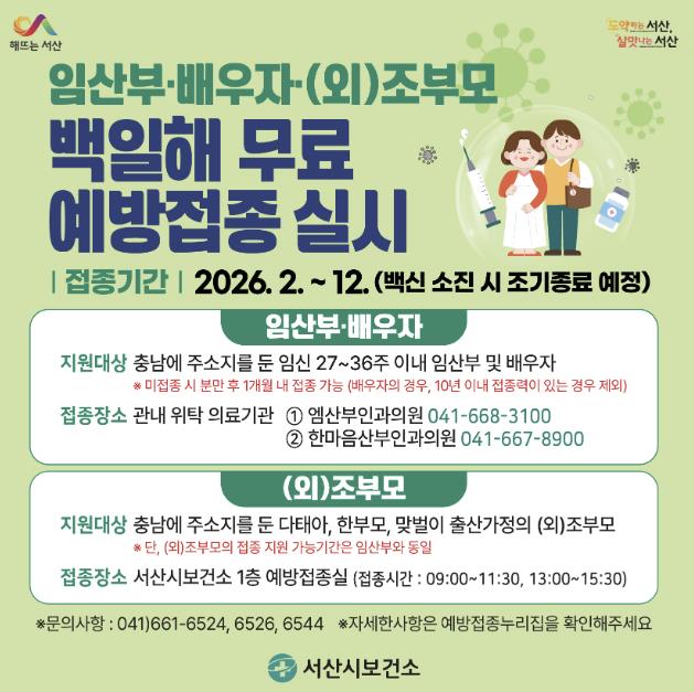 확대로 인해 서산시에 주소지를 둔 다태아·한부모·맞벌이 출산가정의 (외)조부모도 백일해 무료 예방접종을 받을 수 있게 됐다.
