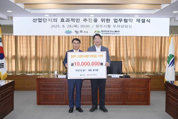 대성건설은 기부금 전달에 앞서 원주시 등과 태봉일반산업단지 조성을 위한 양해각서 체결에 참석했다.
