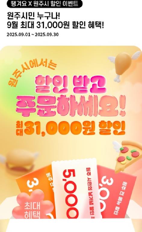 이번 할인쿠폰은 9월 1일부터 5일까지 매일 예산 소진 시까지 제공되며, 앱을 통해 원주시 가맹점에서 2만 원 이상 주문할 때 사용할 수 있다.