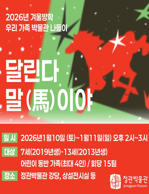 [뉴스노크=김인호 기자] 부산시립박물관 소속 정관박물관은 다가오는 2026년 병오년(丙午年) '붉은 말의 해'를 맞아, 내년 1월 10일부터 11일 양일간 겨울방학 가족 교육프로그램 '겨울방학 우리 가족 박물관 나들이-달린다 말(馬)이야'를 운영한다고 밝혔다.