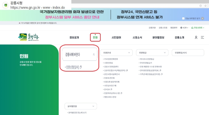 이번에 임시 개통한 '강릉시 새올전자민원창구'는 지난 국가정보자원관리원의 화재로 인한 국민신문고 중단에 따른 온라인 민원상담을 대체하고자 운영하며, 국민신문고시스템이 재개되는 시점에 운영을 종료할 예정이다.