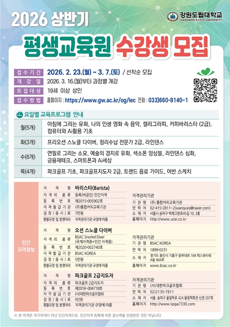 [뉴스노크=김인호 기자] 강원도립대학교는 2월 23일부터 3월 7일까지'2026년도 상반기 평생교육원 수강생'을 모집한다고 밝혔다.