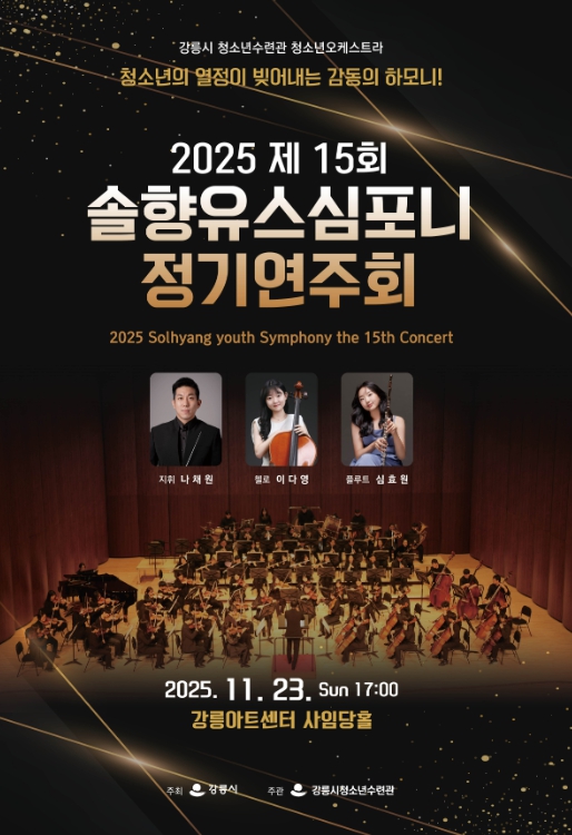 [뉴스노크=김인호 기자] 강릉시 청소년수련관은 오는 11월 23일 오후 5시부터 6시 30분까지 강릉아트센터 사임당홀에서 ‘제15회 강릉시 청소년오케스트라 솔향유스심포니 정기연주회’를 개최한다.