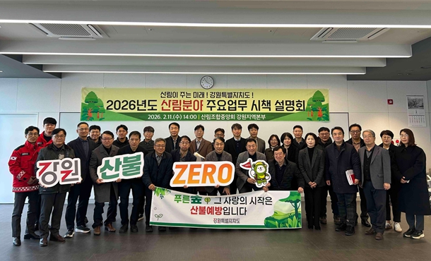 [뉴스노크=김인호 기자] 강원특별자치도는 2월 11일 춘천시 소재 산림조합중앙회 강원지역본부에서 도 산림부서 및 시군 산림부서장 등 산림 관계자 70여 명이 참석한 가운데 ‘2026년 산림분야 주요업무 시책설명회’를 개최했다.
