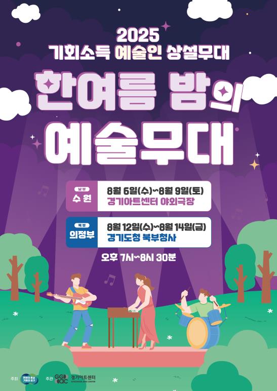 [뉴스노크=김인호 기자] 경기도는 8월 6~9일 경기아트센터 야외극장(수원)에서, 12~14일 경기도청 북부청사 경기평화광장(의정부)에서 오후 7시 기회소득 예술인과 도민이 함께 즐기는 특별한 예술공연 ‘한여름밤의 예술무대’를 무료로 진행한다.