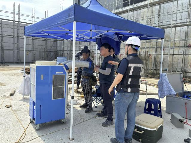▲ 공사장 현장 근로자들이 그늘막에서 이동식 에어컨으로 더위를 식히고 있다. |