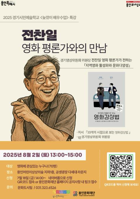 이번 특강은 용인문화재단과 경기문화재단이 협력 운영 중인 '2025 경기시민예술학교 '늦깎이 배우수업''의 특별 프로그램으로, 경기영상위원회 위원장이자 유튜브 채널 ‘칸찬일의 씨네킥’으로도 널리 알려진 전찬일 영화평론가가 강사로 나선다.