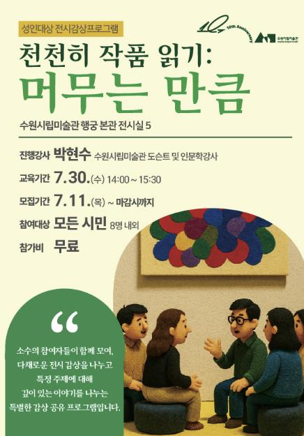 [뉴스노크=김인호 기자] 경기도 수원시립미술관은 전시와 작품에 대한 깊은 이해를 위한 전시 감상 프로그램 '천천히 작품 읽기: 머무는 만큼'을 수원시립미술관 행궁 본관에서 7월 30일에 개최한다.