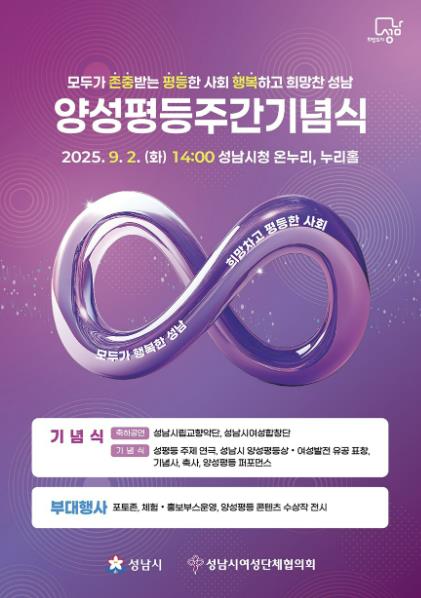 [뉴스노크=김인호 기자] 성남시는 양성평등주간(9.1~7)을 기념해 오는 9월 2일 시청 1층 온누리와 로비에서 다양한 시민 행사를 연다.