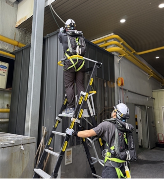 | ▲ 근로자들이 에어백 조끼를 착용하고 2인 1조로 K사다리(작업발판) 활용해 작업을 진행하고 있다. |