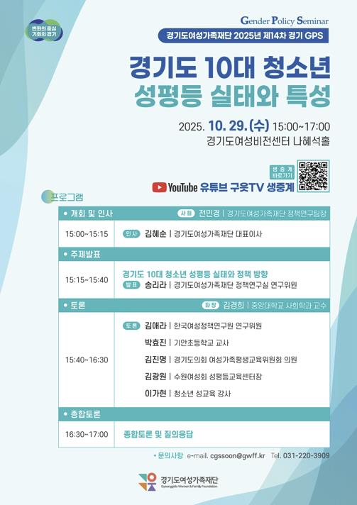 유튜브 생중계로 개최하는 토론회는 재단이 수행 중인 '경기도 10대 청소년 성평등 실태조사' 연구결과를 공유하고 향후 정책방향을 논의하기 위해 마련됐다.