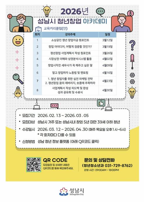 [뉴스노크=김인호 기자] 성남시는 오는 3월 5일까지 ‘청년창업 아카데미’ 무료 교육생 30명을 모집한다.