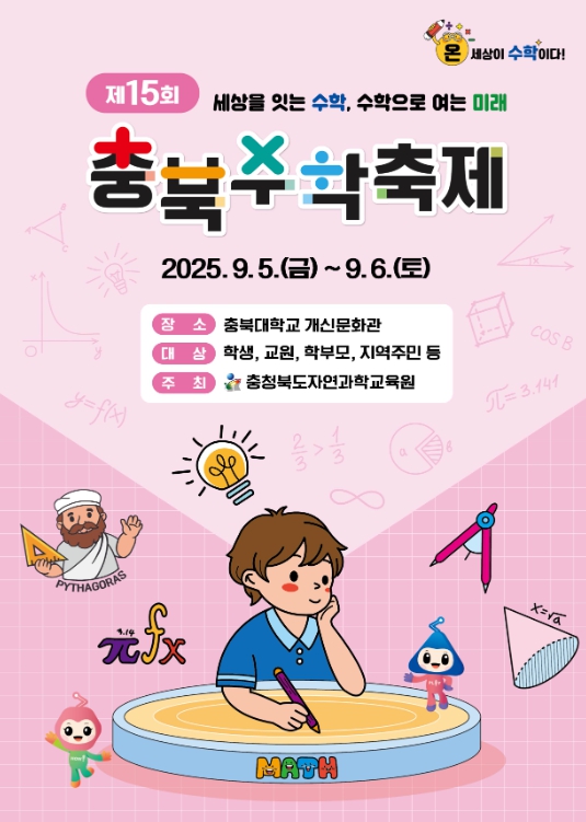 윤건영 교육감은 “준비된 다양한 프로그램 속에서 세상과 연결된 수학의 가치를 직접 느낄 수 있는 계기가 되길 바라며, 나아가 축제에서의 경험이 수학에 대한 자신감과 문제해결력 성장에 도움이 되길 바란다”고밝혔다.