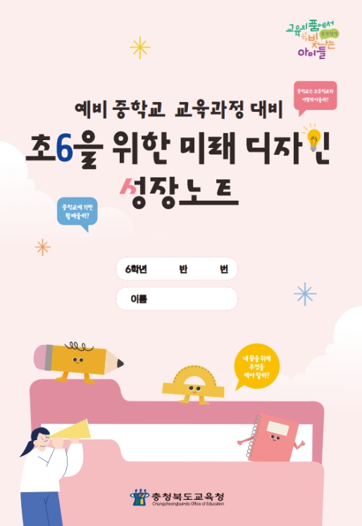 [뉴스노크=김인호 기자] 충청북도교육청은 초등학교 6학년 학생들의 중학교 진학 준비와 진로 설계를 돕기 위해〈예비 중학교 교육과정 대비 초6을 위한 미래 디자인 성장노트'를 제작해 도내 모든 초등학교에 책자로 보급했다고 밝혔다.
