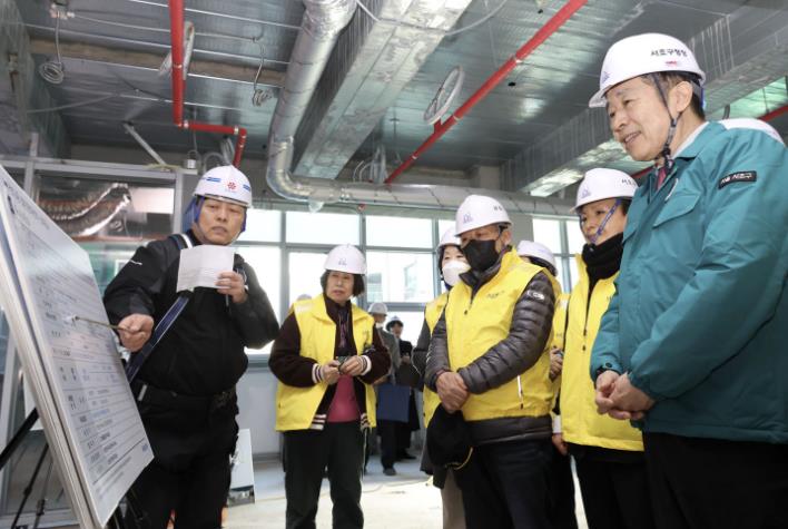| ▲ 전성수 서초구청장(맨 오른쪽)이 3일 서초3동 열린문화센터 신축 현장에서 주민들과 함께 현장소장의 공사 추진현황과 안전조치 내역 브리핑을 청취하고 있다. |