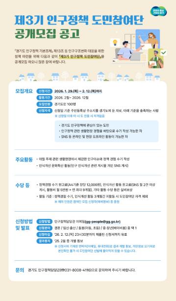 [뉴스노크=김인호 기자] 경기도가 정책 대상자가 직접 정책개선에 참여하는 ‘제3기 인구정책 도민참여단’ 100명을 공개 모집한다.