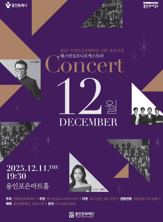 [뉴스노크=김인호 기자] 용인문화재단은 오는 12월 11일 오후 7시 30분, 용인포은아트홀에서 웨스턴심포니오케스트라 '콘서트 ‘12월’' 공연을 개최한다.
