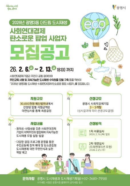 시는 오는 3월부터 12월까지 광명3동 더드림 도시재생사업의 일환인 ‘2026년 광명3동 도시재생-사회연대경제 탄소로운 팝업 사업’을 추진한다고 10일 밝혔다.