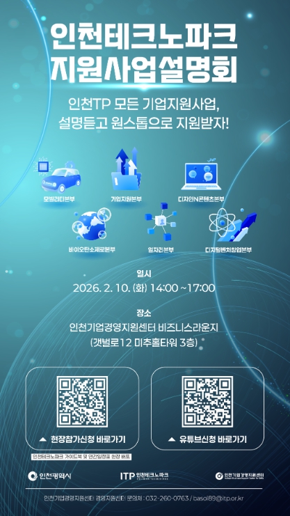설명회에서는 ▲2026년 인천TP 주요 지원사업 안내 ▲본부별 지원정책 설명 ▲기업 맞춤형 질의응답 및 현장 상담 등이 진행될 예정이다.