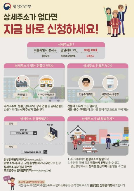 상세 주소는 건물주 또는 임차인이 정부24 또는 군청 민원과를 통해 신청이 가능하며, 이후 주민등록 정정 신고를 통해 법정 주소로 사용할 수 있다. 기타 자세한 사항은 군청 민원과로 문의하면 안내받을 수 있다.