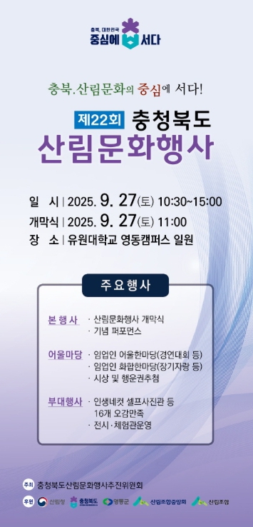 [뉴스노크=김인호 기자] 제22회 충청북도 산림문화행사가 오는 27일 오전 10시 30분부터 영동군 유원대학교 영동캠퍼스 일원(영동읍 대학로 310)에서 열린다.