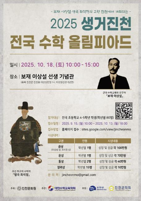 한편, ‘수학자의 도시’ 진천은 조선 최고의 수학자 명곡 최석정과 근대 수학교육의 선구자 보재 이상설 선생의 고향으로, 학문의 전통이 살아 있는 지역이다.
