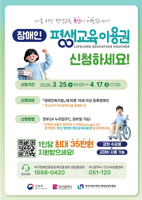 [뉴스노크=김인호 기자] 부산시는 오는 3월 25일부터 소외계층 성인(저소득층 및 장애인 등)을 대상으로 '2026년 부산광역시 평생교육이용권' 신청․접수를 시작한다고 밝혔다.