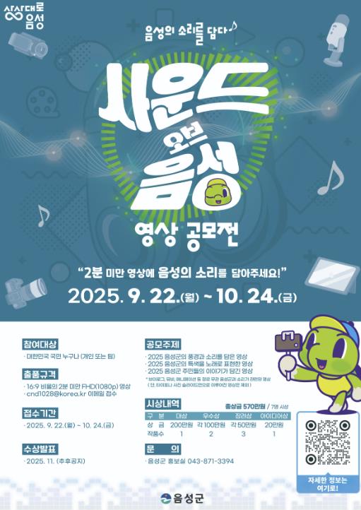 [뉴스노크=김인호 기자] 음성군은 오는 10월 24일까지 2025 사운드 오브 음성 영상 공모전을 개최한다고 밝혔다.