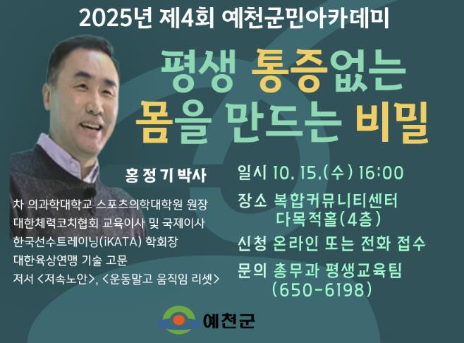 [뉴스노크=김인호 기자] 예천군은 10월 15일 오후4시, 복합커뮤니티센터 다목적홀에서 ‘2025년 제4회 예천군민 아카데미’를 개최한다.