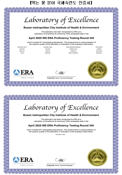 [뉴스노크=김인호 기자] 부산시 보건환경연구원은 먹는 물 분야 분석 능력 검증을 위해 참가한 미국 환경자원협회(ERA) 주관 국제숙련도 평가에서 전 항목 '만족' 판정을 받아 '최고 등급' 인증을 획득했다고 밝혔다.