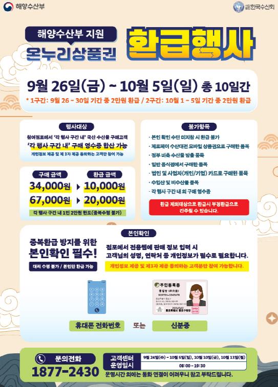 이번 행사는 모두 국내산 수산물만을 대상으로 하며, 젓갈류 등 국내산 원물 70% 이상을 사용한 가공식품도 포함된다. 다만 수산대전 모바일상품권 구매 품목, 정부 비축 수산물, 일반음식점과 수입 수산물은 행사 대상에서 제외된다.