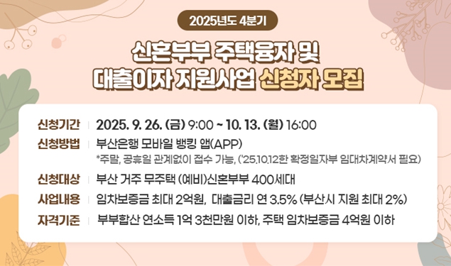 [뉴스노크=김인호 기자] 부산시는 올해 4분기 '신혼부부 주택융자 및 대출이자 지원사업'의 지원 대상자를 내일(26일)부터 10월 13일까지 모집한다고 밝혔다.