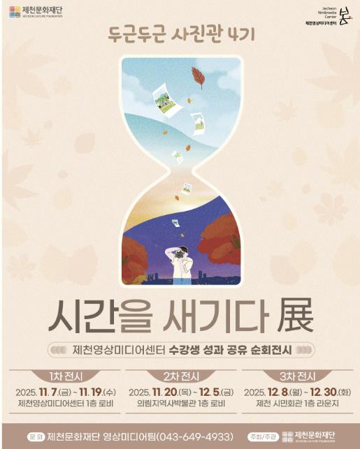 [뉴스노크=김인호 기자] 제천문화재단이 제천영상미디어센터 교육 수강생들의 작품을 순회 전시하는 '두근두근 사진관 4기 : 시간을 새기다 展'을 오는 11월 7일부터 12월 30일까지 제천시 일원에서 개최한다.