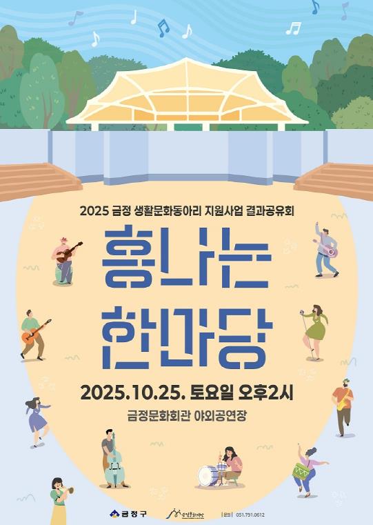 [뉴스노크=김인호 기자] 부산시 금정구 금정문화재단은 금정생활문화동아리 지원사업 '흥나는 금정'의 결과 공유회 “흥나는 한마당”프로그램을 오는 10월 25일 오후 2시부터 오후 4시까지 금정문화회관 야외공연장에서 개최한다고 밝혔다.