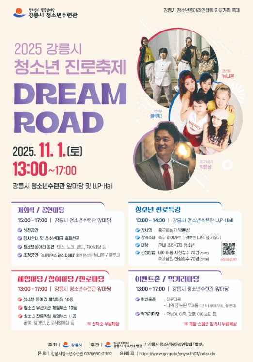 [뉴스노크=김인호 기자] 강릉시 청소년수련관은 오는 11월 1일 오후 1시부터 5시까지 강릉시 청소년수련관 앞마당 및 유피홀에서 청소년들의 진로 탐색과 자율적 참여 확대를 위한 2025 강릉시 청소년 진로축제 'Dream Road'를 개최한다.