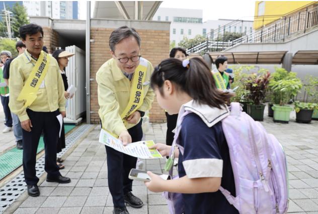 | ▲ 유성훈 금천구청장이 지난 25일 금나래초등학교 앞에서 유괴 예방 안전 수칙을 홍보하고 있다 |