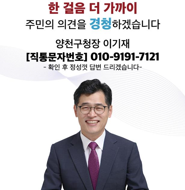 직접소통·현장중시·혁신행정을 구정 운영의 핵심 가치로 내세워온 이기재 양천구청장은 2022년 8월 개인 휴대전화 번호를 공개하며 ‘구청장 직통 문자 민원 서비스’를 도입했다.