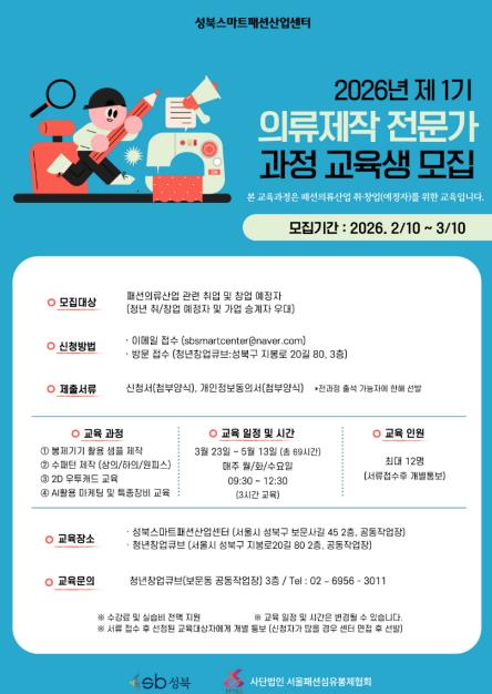 [뉴스노크=김인호 기자] 서울 성북구가 (사)서울패션섬유봉제협회에 위탁 운영 중인 성북스마트패션산업센터에서 2026년 제1기 의류제작 전문가과정 교육생을 모집한다.