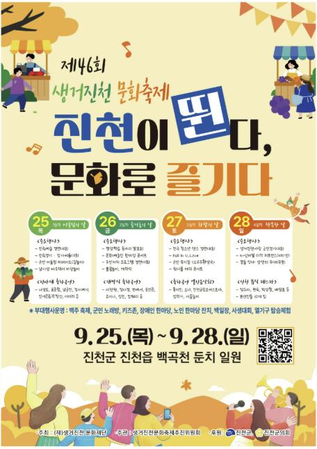[뉴스노크=김인호 기자] 충북 진천군 대표 문화예술축제인 ‘제46회 생거진천문화축제’가 ‘진천이 뛴다! 문화로 즐기다!’라는 주제로, 오는 9월 25일부터 28일까지 진천읍 백곡천 둔치 일원에서 성대하게 개최된다.