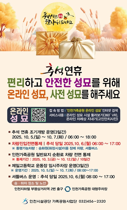 또한, 명절 연휴(10.5.~10.7.) 3일간 봉안당을 2시간 조기 개방(오전 6시~오후 6시)하고, 제일고등학교 운동장을 오전 8시부터 오후 5시까지 임시주차장으로 운영해 주차 및 교통 혼잡을 최소화할 방침이다.