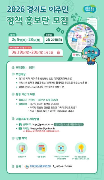 [뉴스노크=김인호 기자] 경기도이민사회통합지원센터에서 오는 23일까지 ‘2026 경기도 이주민 정책 홍보단’ 15명을 모집한다.