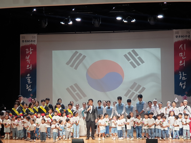 행사는 지역 어르신들의 광복 관련 인터뷰 영상을 시작으로 평생학습동아리와 지역 예술인, 전통예술 교육기관, 어린이집 등이 협력해 ▲인터뷰 영상 ▲1인극 ▲전통예술 공연 ▲크로스오버 협연 ▲어린이 합창 등 10개 프로그램이 이어졌다. 특히 어린이집 합창은 미래 세대가 전하는 희망의 메시지를 통해 광복의 울림을 오늘의 무대로 확장하며 큰 감동을 줬다.