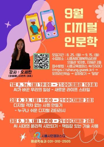 우선, 9월 강의는 9월 16일(인공지능(AI)이 바꾼 우리의 일상), 9월 23일(디지털 격차 없는 사회 만들기), 9월 30일(인공지능 시대의 윤리적 시민 되기) 등으로 구성됐으며, 마음매니지먼트 오세란 대표가 강의를 진행한다.