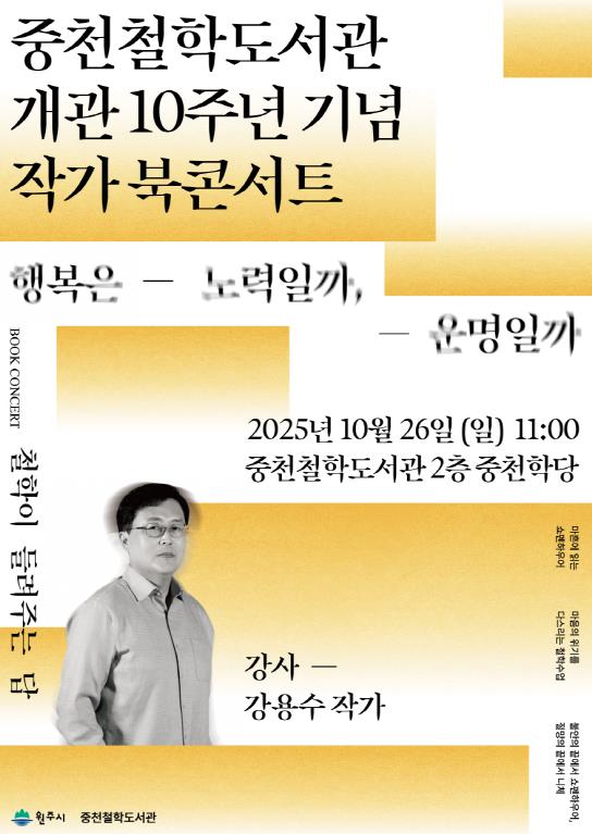 [뉴스노크=김인호 기자] 원주시 중천철학도서관은 오는 26일 오전 11시, 개관 10주년 기념 작가 북콘서트를 개최한다.