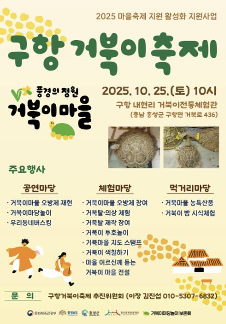 한편, ‘구항 거북이 축제’는 2025년 마을 축제 지원 및 활성화 사업의 일환으로 추진되며, 지역 전통문화를 기반으로 주민이 직접 기획 및 운영하는 생활 속 문화축제로 자리매김하고 있다.