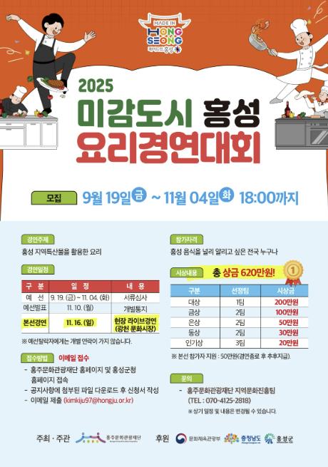 [뉴스노크=김인호 기자] 홍성군은 내달 4일까지 ‘2025년 미감도시 홍성 요리경연대회’의 참가자를 추가 공개 모집한다고 밝혔다.