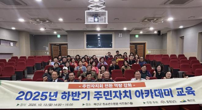[뉴스노크=김인호 기자] 예산군은 예산군청소년수련관 비전홀에서 주민자치회 미전환 읍면 주민자치위원 50여명을 대상으로 ‘2025년 하반기 주민자치 아카데미 집합교육’을 진행했다고 17일 밝혔다.
