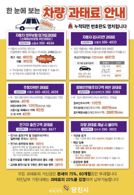 [뉴스노크=김인호 기자] 당진시는 차량 관련 과태료 정보를 한눈에 확인할 수 있는‘차량 과태료 통합 안내문’을 제작해 관내 아파트 단지와 각 행정복지센터에 비치했다고 15일 밝혔다.