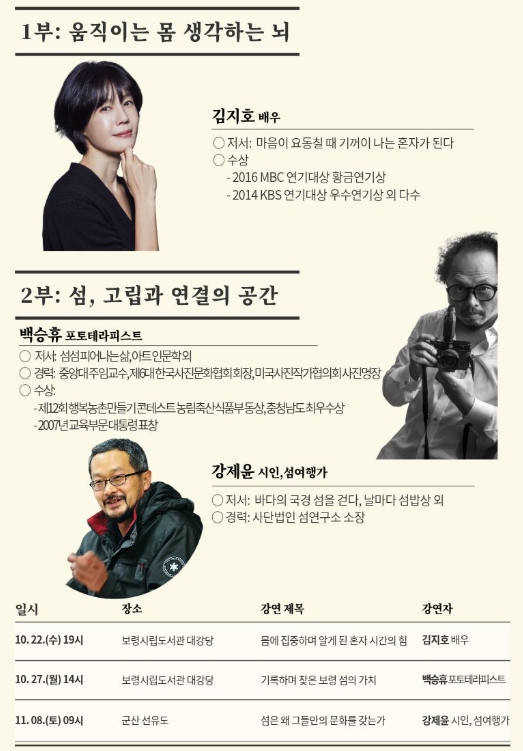 11월에는 강제윤 섬연구소 소장, 오은 시인, 김태훈 팝칼럼니스트, 김탁환 소설가 등이 섬, 독서, 영화를 주제로 강연과 탐방을 이어간다.